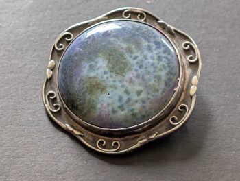 Ruskin pottery was founded in 1889 by William Howson Taylor who named it after the great writer and artist John Ruskin. Ruskin pots are renowned for their wonderful and innovative glazes. Inspiration came from old oriental pots which had highly skilled high fire glazes. Taylor also made small ceramic roundels, initially to go into furniture and copper mirrors for Liberty. Later, the roundels were sold in kits for women who wanted to be part of the Arts and Crafts Movement, so they could make their own jewellery at home out of soft pewter to be worn as a badge of their commitment to the Movement.