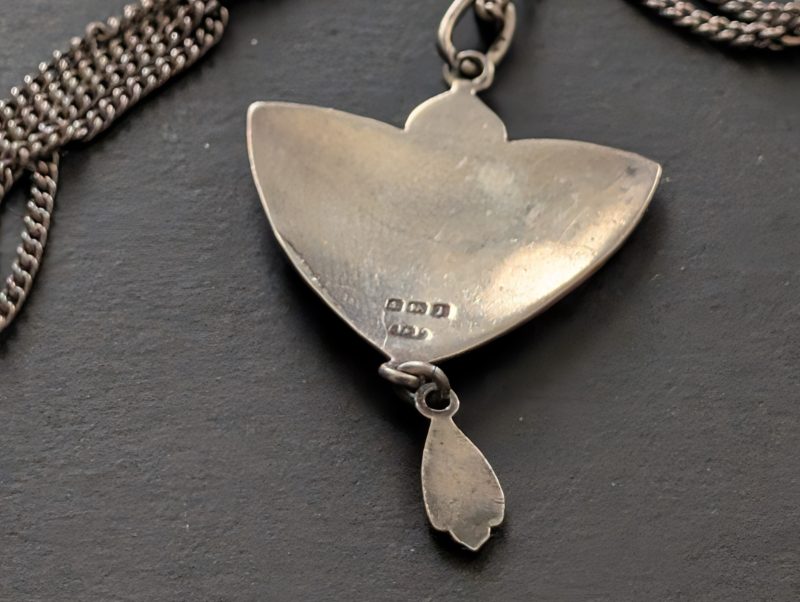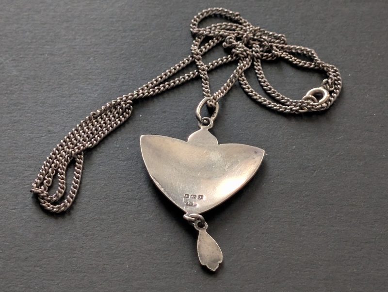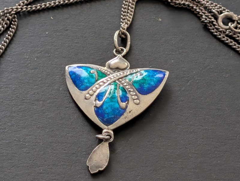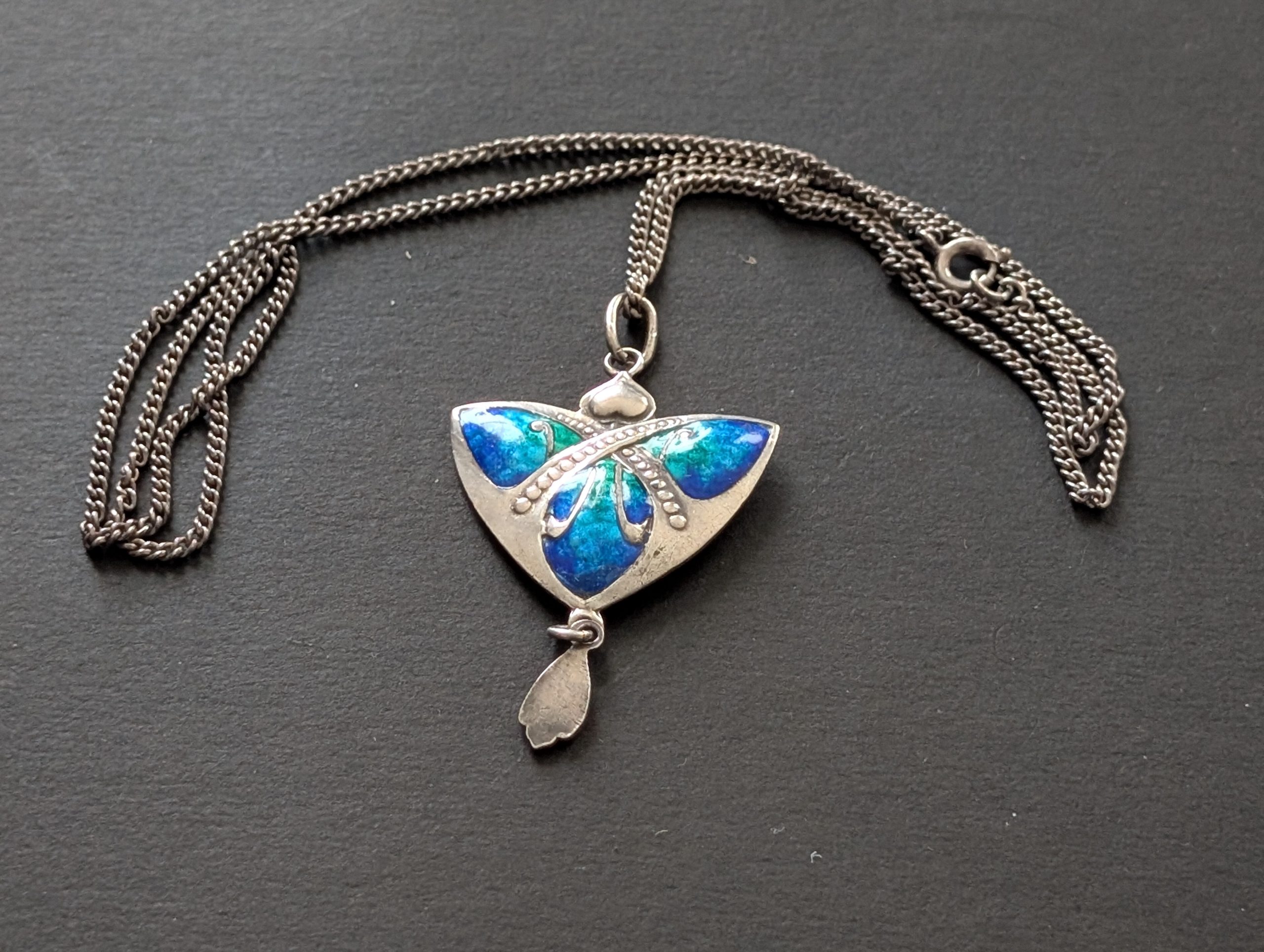 1910 James Fenton heart-shaped silver and blue-green enamel pendant on chain